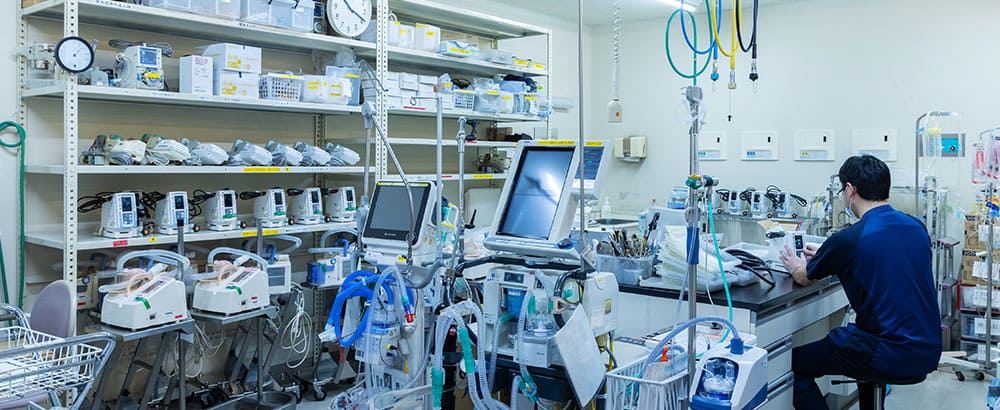 人工呼吸器を始め生命維持管理装置の日常点検・定期点検計画の実施、院内にある1000台以上の医療機器の消耗部品の交換、装置トラブル発生時の対応を年間約2000件行っています。