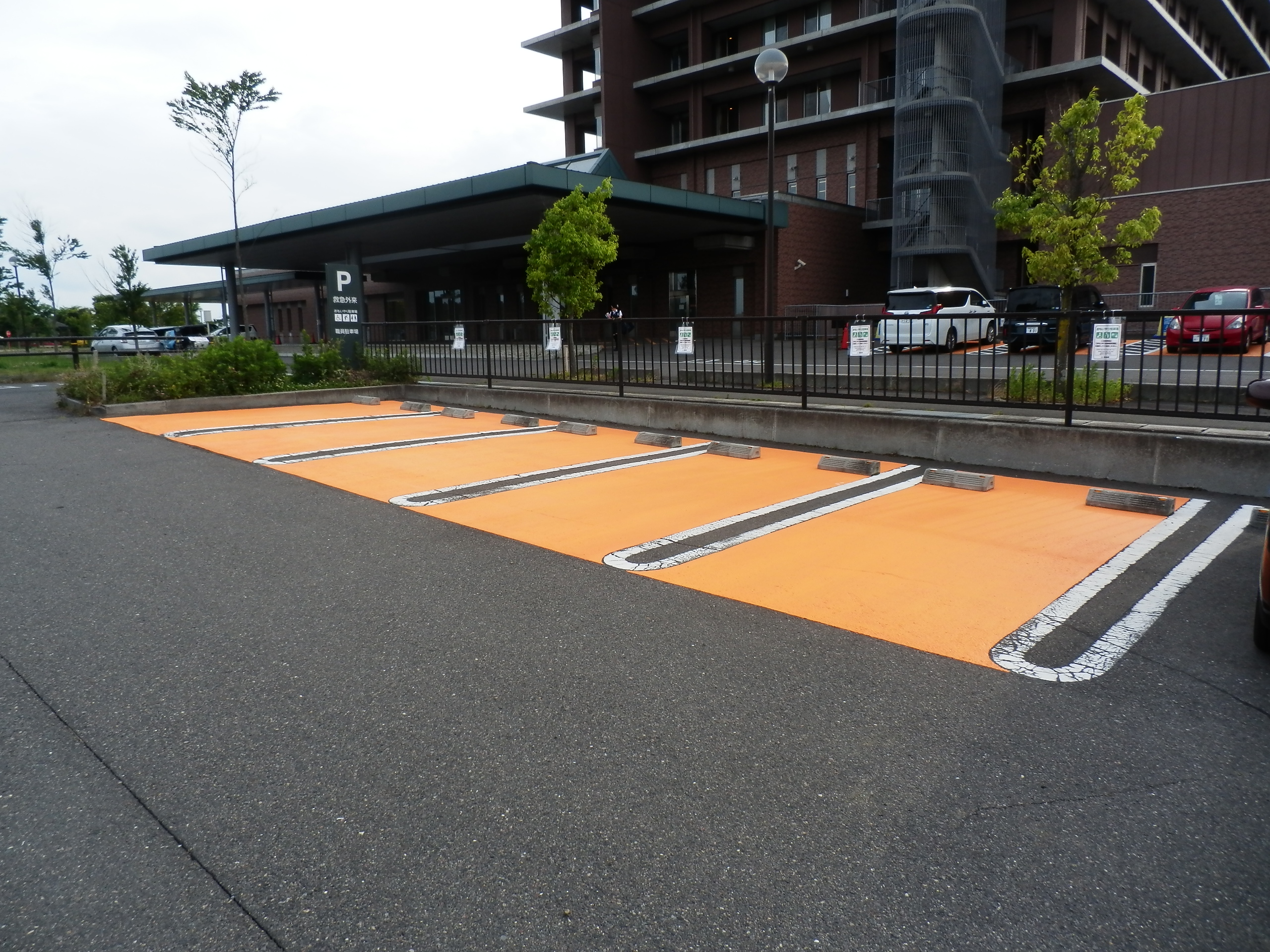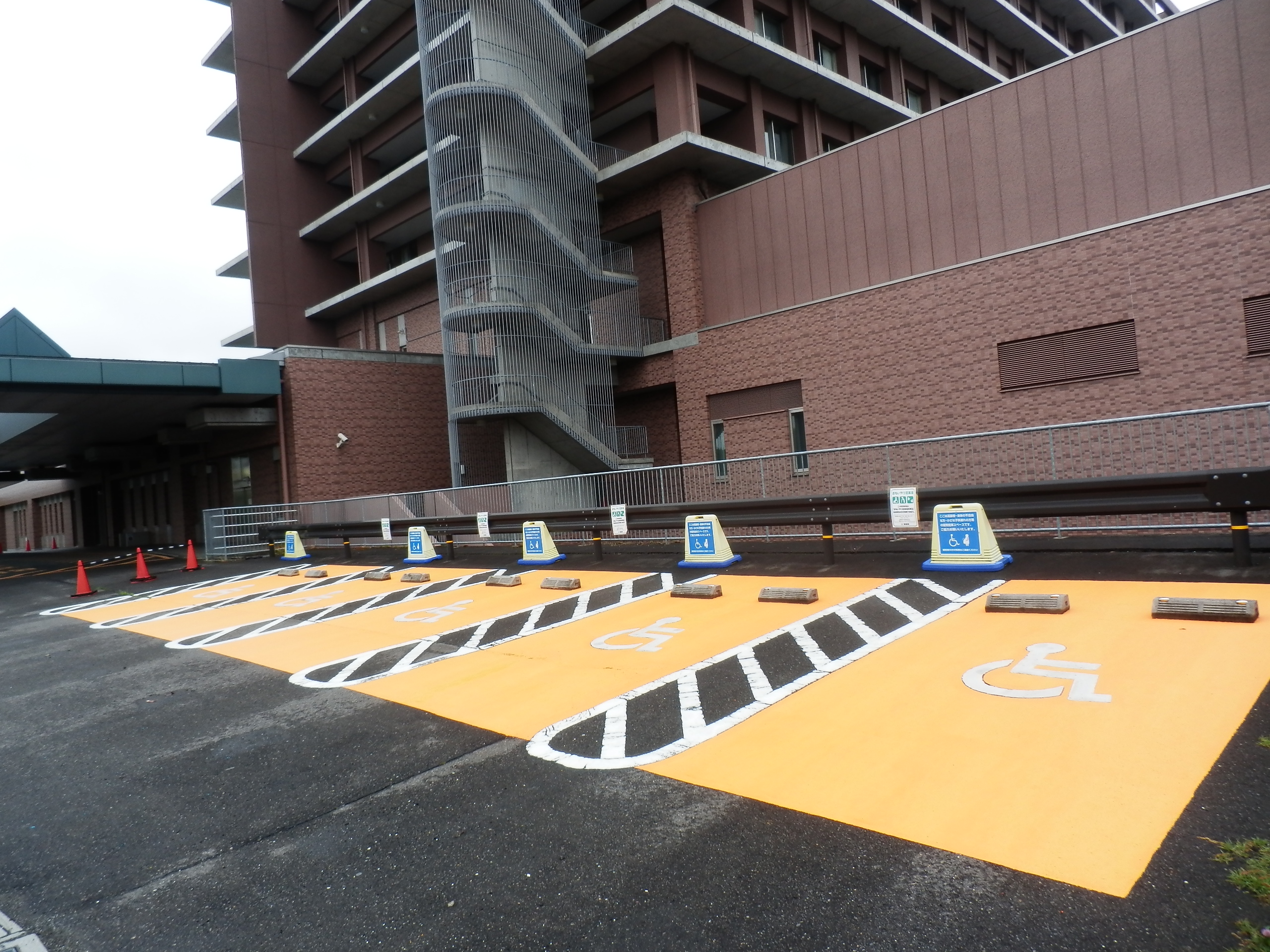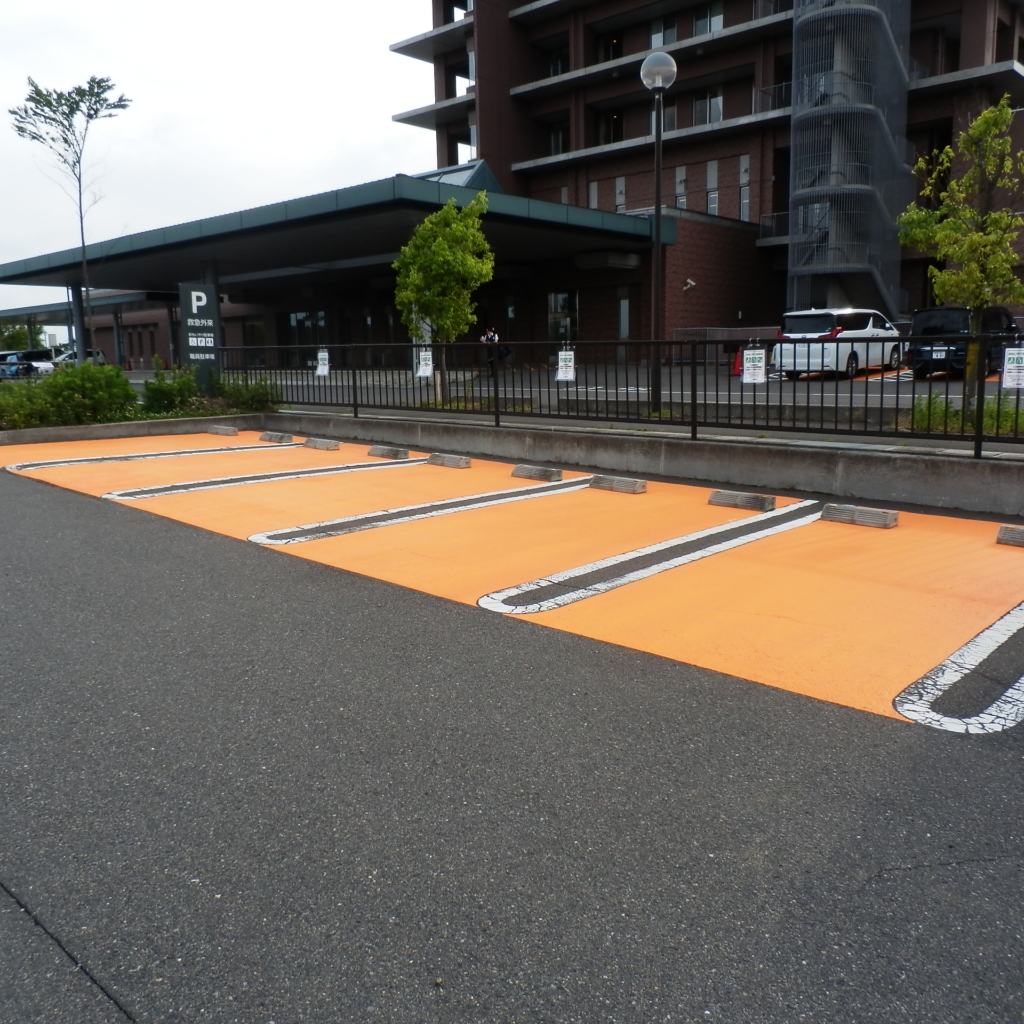 当院東側の救急外来出入口前に、「障がい者専用駐車場」を4台分、「おもいやり駐車場」を10台分、計14台分を整備しました。